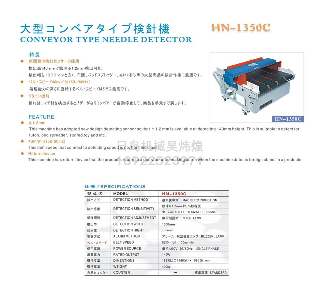 本機在被褥等大尺寸商品的檢測方面可以發(fā)揮威力。 檢測到斷針時(shí),警報器鳴響,傳送帶停止,再將不良品退回到作業(yè)者前面。 標傳感度調節為無(wú)級調節,所以可以不受服飾附屬品大小·種類(lèi)的影響,進(jìn)行細微的調節。 準裝配有產(chǎn)品導向裝置。 為了適應多人檢測大尺寸商品的作業(yè)需要,在機械的兩側設置了傳送帶啟動(dòng)開(kāi)關(guān)。 沿機械的左右方向在各半部設置了傳感度調節器。 能夠檢測出女裝.童裝.男裝等各種服裝中混入的金屬片(鐵質(zhì))。 可以在自己的電腦(WINDOWS.XP)中利用其他軟件讀取檢針數據.對讀取的數據可以按自己的目的有效活用 |