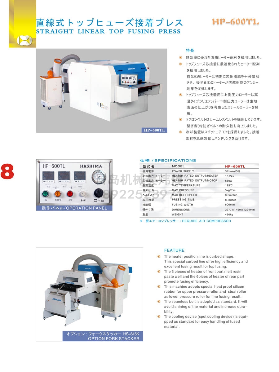 加熱板采用彎曲的排列方式,提高熱效率。 采用了最適合襯衫領(lǐng)子襯布粘合的加熱板排列方式,前3塊加熱板使襯布的膠粒充分溶解,后6塊加熱板促使溶解的膠粒達到更好的效果。 本機上側壓力軸采用耐高溫硅膠,下側壓力軸為不銹鋼材料,可使粘合的布料表面平整。 采用了無(wú)接縫特氟龍皮帶,避免了接縫處斷裂情況的發(fā)生,延長(cháng)了使用壽命。 采用輔助空調冷卻裝置,是粘合布料快速冷卻的好幫手。 |